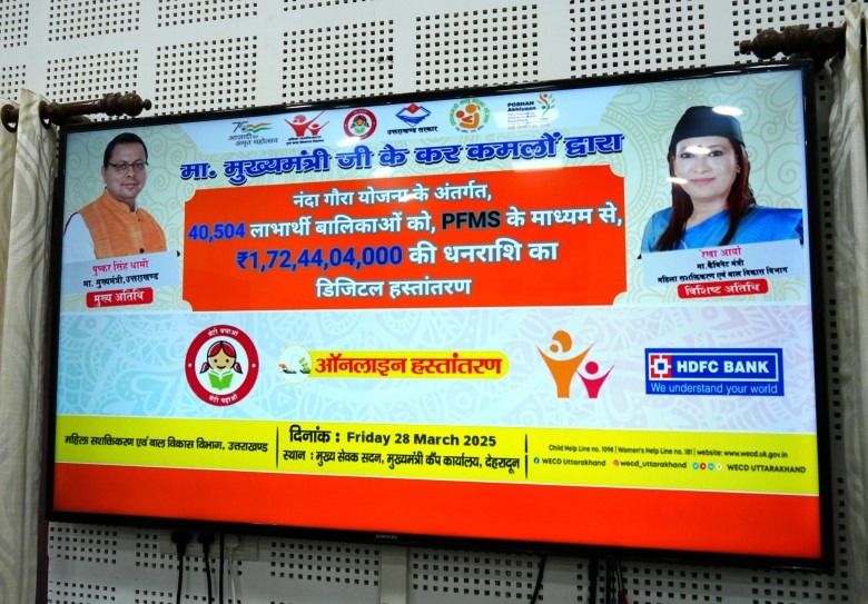 मुख्यमंत्री श्री पुष्कर सिंह धामी ने शुक्रवार को मुख्यमंत्री कैंप कार्यालय से डीबीटी के माध्यम से नंदा गौरा योजना के 40 हजार 504 लाभार्थियों को वित्तीय वर्ष 2024-25 में लाभान्वित 01 अरब 72 करोड़ 44 लाख 04 हजार रुपए की धनराशि का वितरण किया। इस योजना के माध्यम से विगत 05 वर्ष में 02 लाख 84 हजार 559 लाभार्थियों को कुल 09 अरब 68 करोड़ 64 लाख 51 हजार की धनराशि डीबीटी के माध्यम से प्रदान की गई।